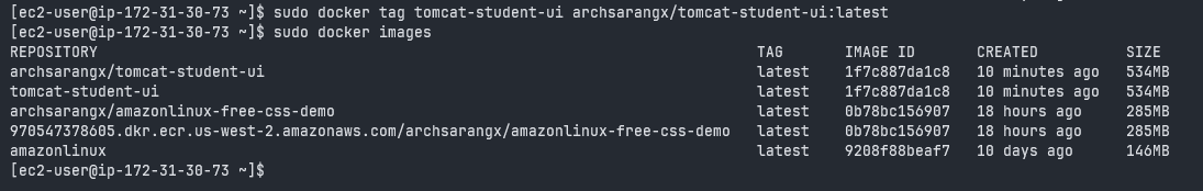 docker tag archsarangx/tomcat-student-ui:latest 970547378605.dkr.ecr.us-west-2.amazonaws.com/archsarangx/tomcat-student-ui:latestdocker push 970547378605.dkr.ecr.us-west-2.amazonaws.com/archsarangx/tomcat-student-ui:latest